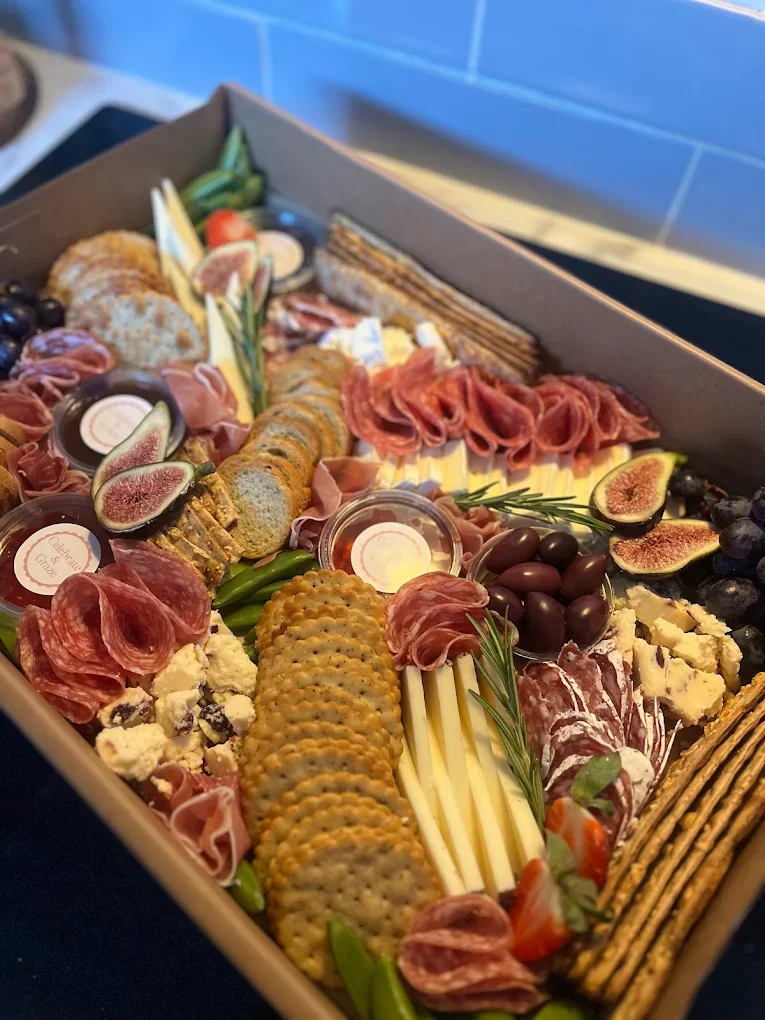 Our grazing boxes include a carefully selected mix of cheeses and cured meats, paired with complementary accompaniments.